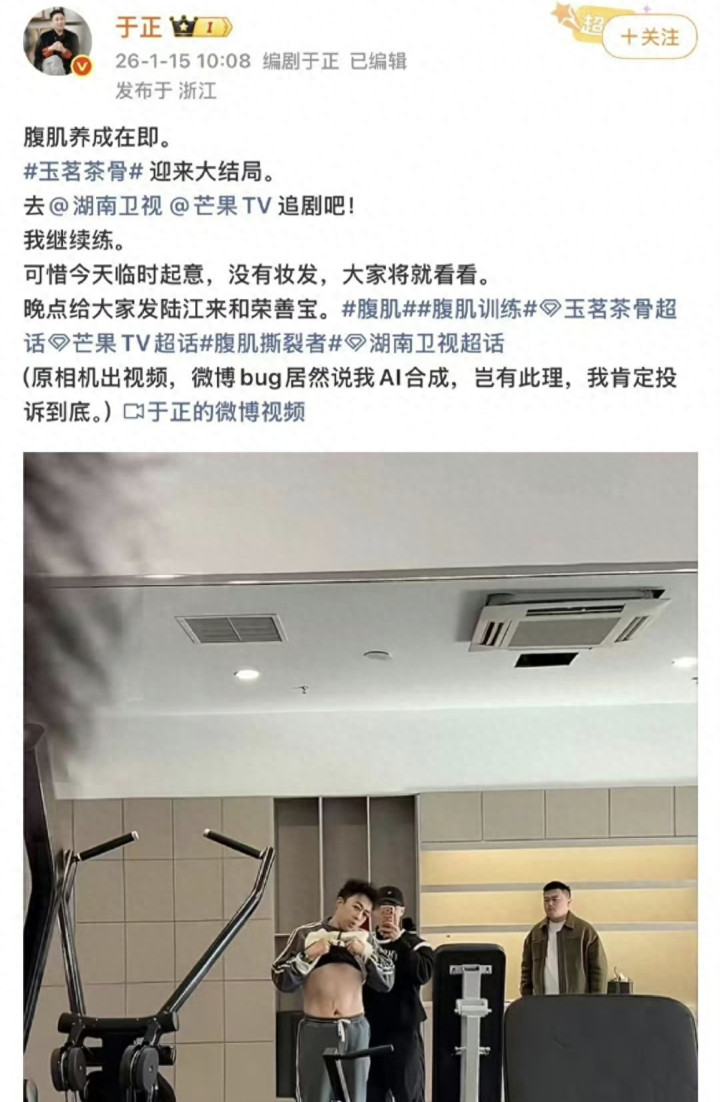“我辛辛苦苦练出八块腹肌,微博一句‘AI合成’直接把我打成‘赛博骗子’!”15日深夜,于正顶着一张“地铁老人手机”脸发博,配图是《玉茗茶骨》大结局里他赤膊上阵的片段——油亮腹肌块块分明,结果系统红字赫然写着:“疑似AI生成,已限制传播。”